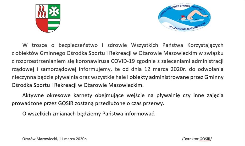 Komunikat GOSiR w Ożarowie Mazowieckim w związku z rozprzestrzenianiem się koronawirusa COVID-19